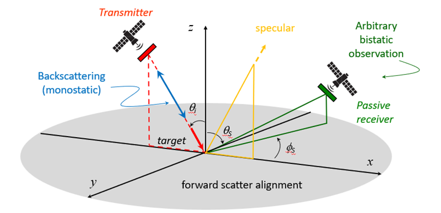 The figure below described the geometry of the observation of the target, which is bistatic in the most general case